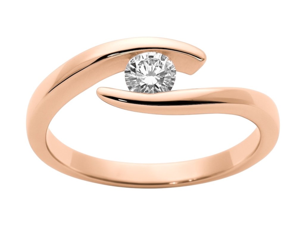 Krásný zásnubní prstýnek z růžového zlata AU 585/1000. Prsten zdobí jeden centrální briliant.