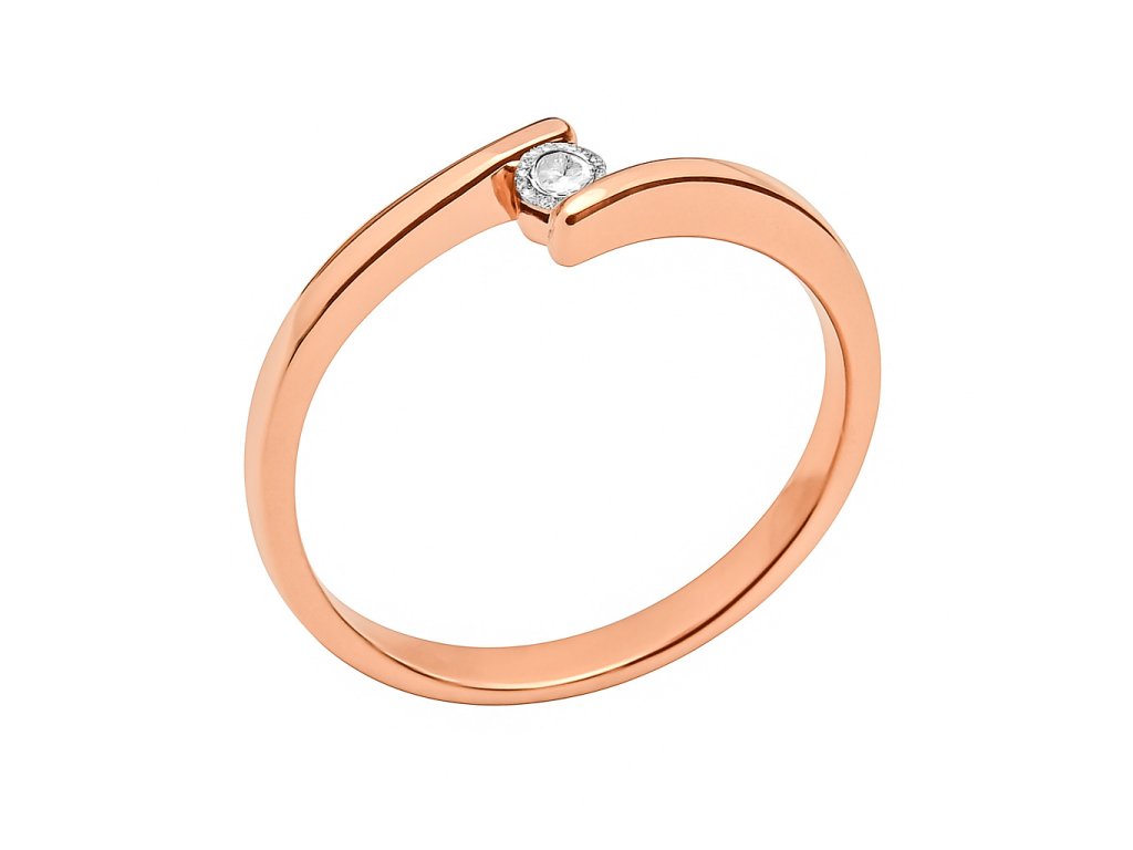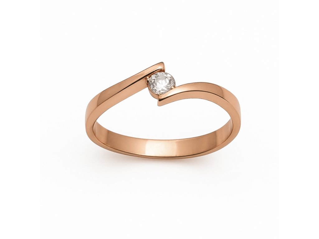 Krásný zásnubní prstýnek z růžového zlata AU 585/1000 zdobený briliantem. Prsten je oblíbený pro svoji jednoduchost.