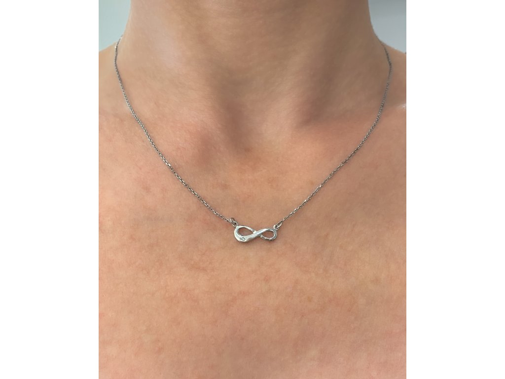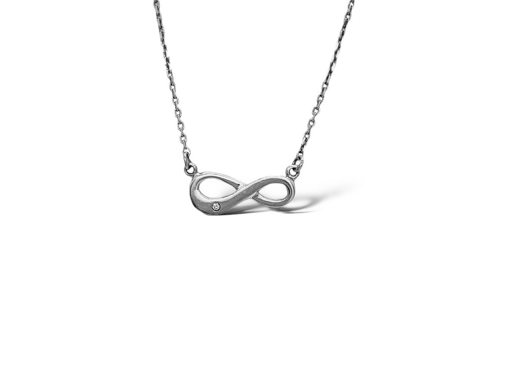 Dámský briliantový přívěs z bílého zlata AU 585/1000. Přívěs ve tvaru nekonečna zdobí drobný briliant. Řetízek v délce 42 až 45 cm je součástí přívěsku.