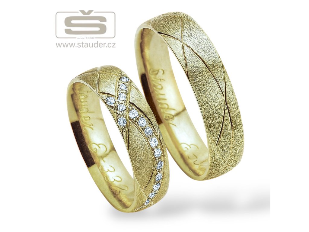 Snubní prsteny E332 jsou široké 5 mm, silné 1,4 mm, zdobené různě se křížícími lesklými linkami v matném povrchu. Dámský prsten je osazen 18-ti zirkony, nebo brilianty. Zaoblená vnitřní strana pro pohodlnější nošení. Váha ve velikostech 52 + 62 je asi 8,7 g. Prsteny je možné vyrobit užší či širší, nebo z jiné barvy zlata, přesně podle Vašeho přání. Dodací lhůta snubních prstenů je 3 týdny. Záruka 10 let.