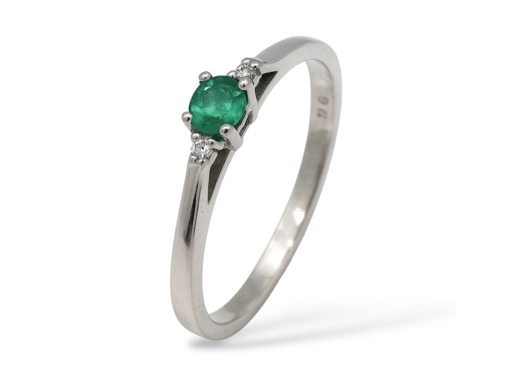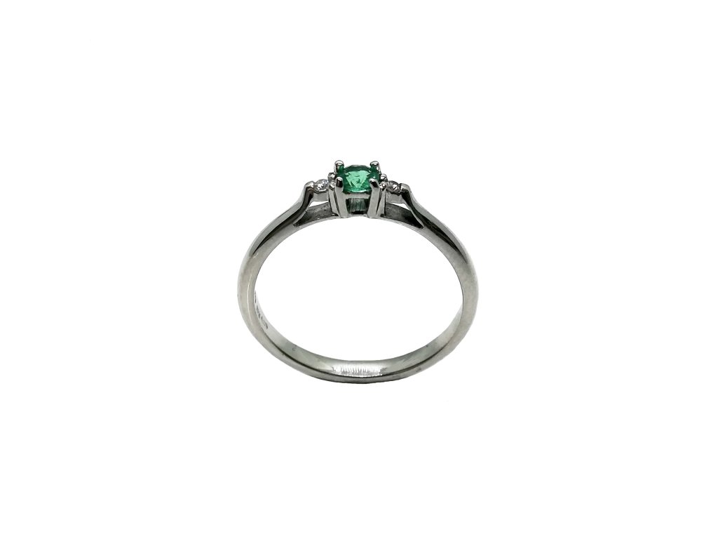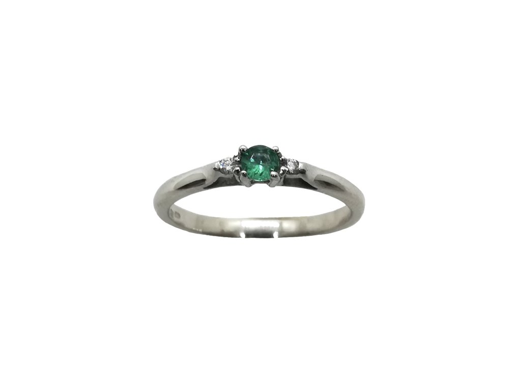 Jemný zásnubní prstýnek z bílého zlata AU 585/1000 zdobený brilianty a smaragdem. Prsten je velice oblíbený pro svoji jednoduchost.