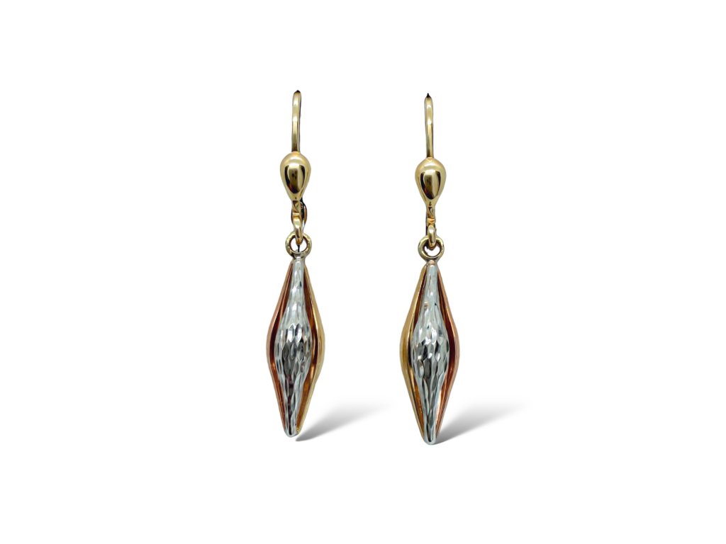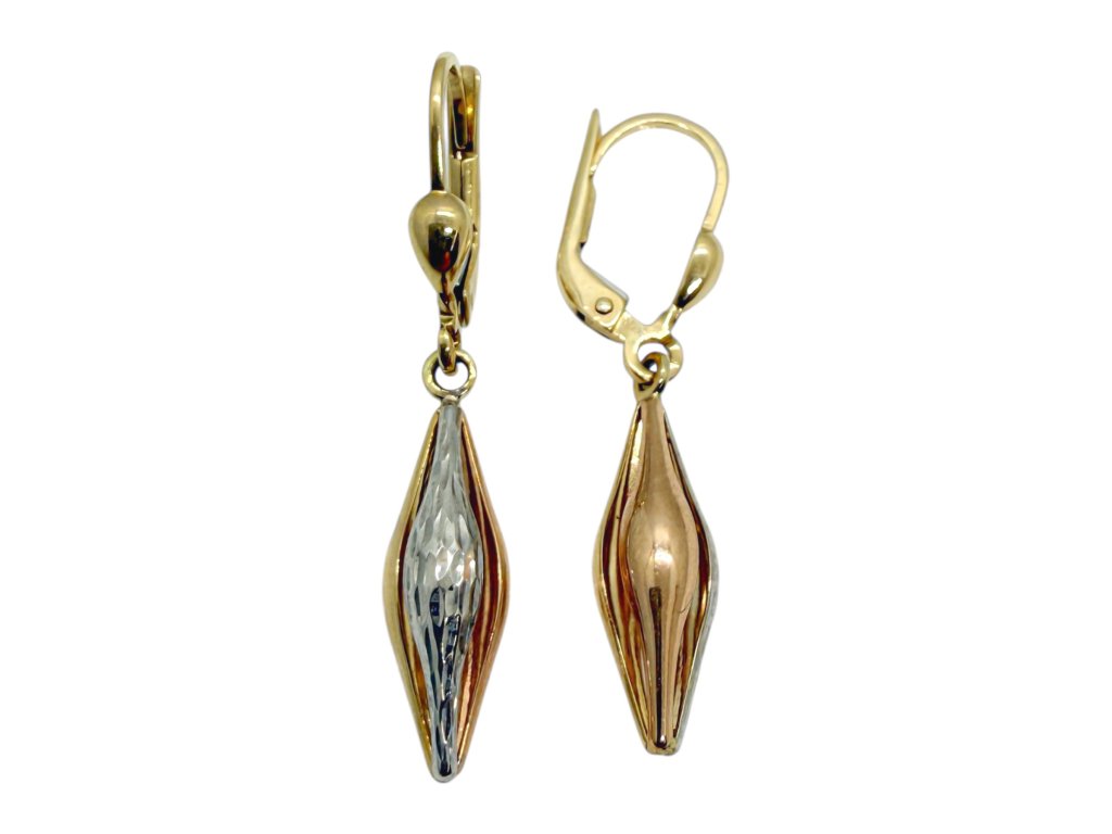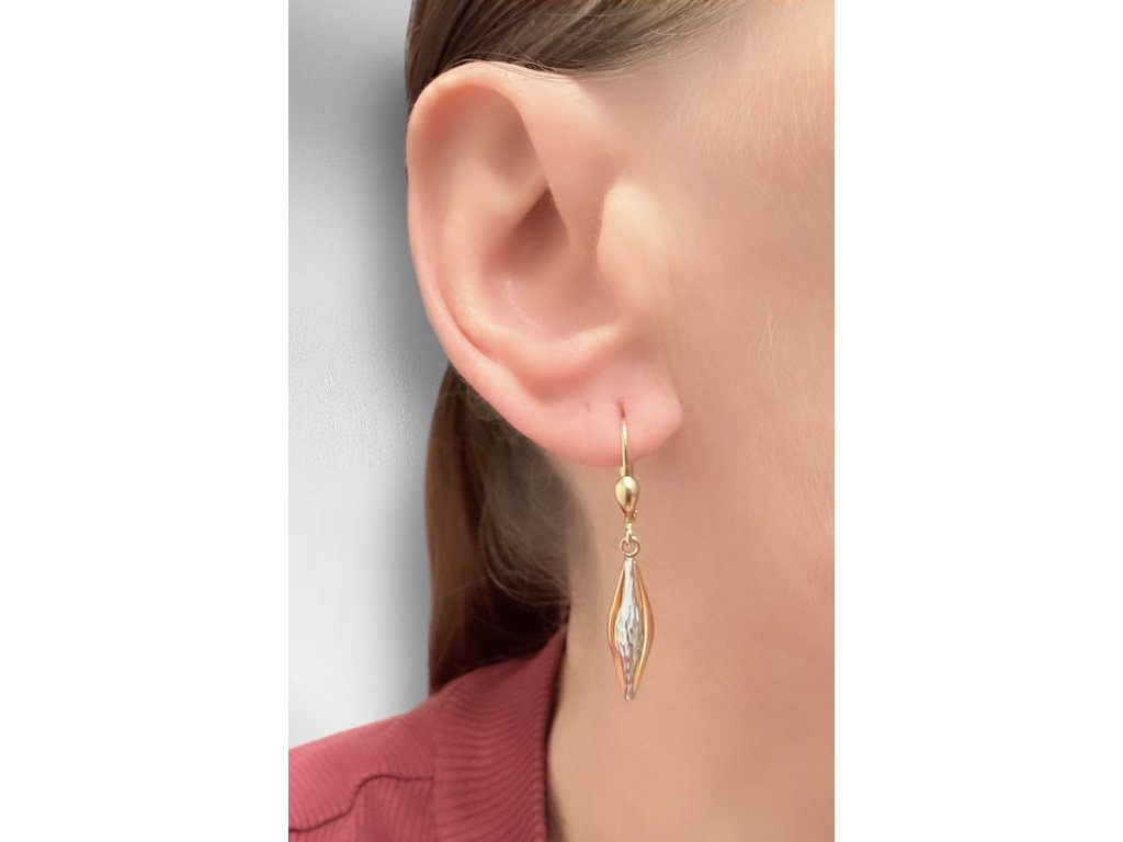 Dámské visací náušnice ze žlutého zlata AU 585/1000. Náušnice zdobí kombinace bílého a růžového zlata.
