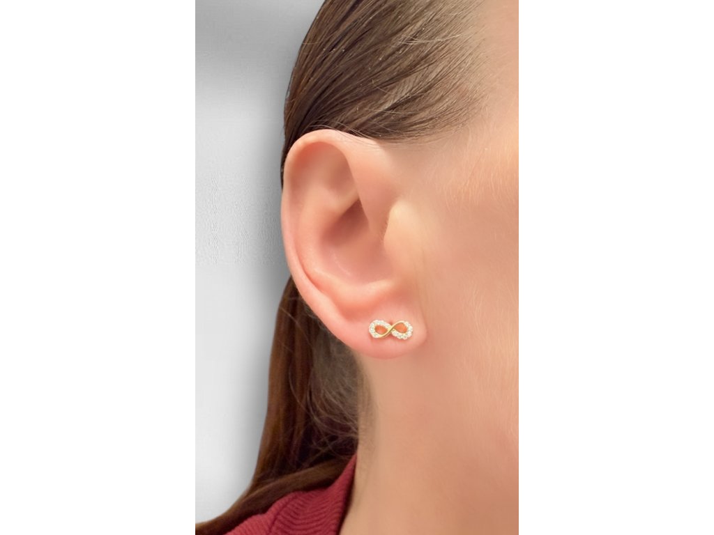 Dámské náušnice ze žlutého zlata AU 585/1000. Náušnice ve tvaru nekonečna, zdobené zirkony.