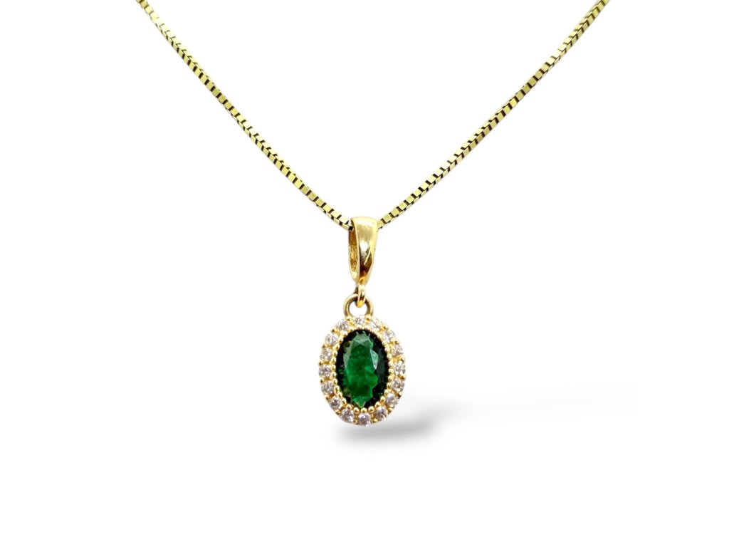 Dámský přívěšek ze žlutého zlata AU 585/1000. Přívěs zdobí jeden centrální zirkon zelené barvy, který doplňují drobné zirkony. Řetízek není součástí přívěsu.