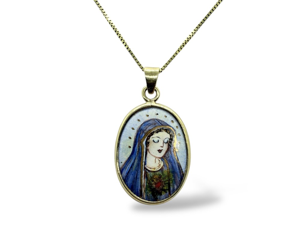 Dámský přívěšek madonky ze žlutého zlata AU 585/1000. Madonka je ručně malovaný smalt. Řetízek není součástí přívěsu.
