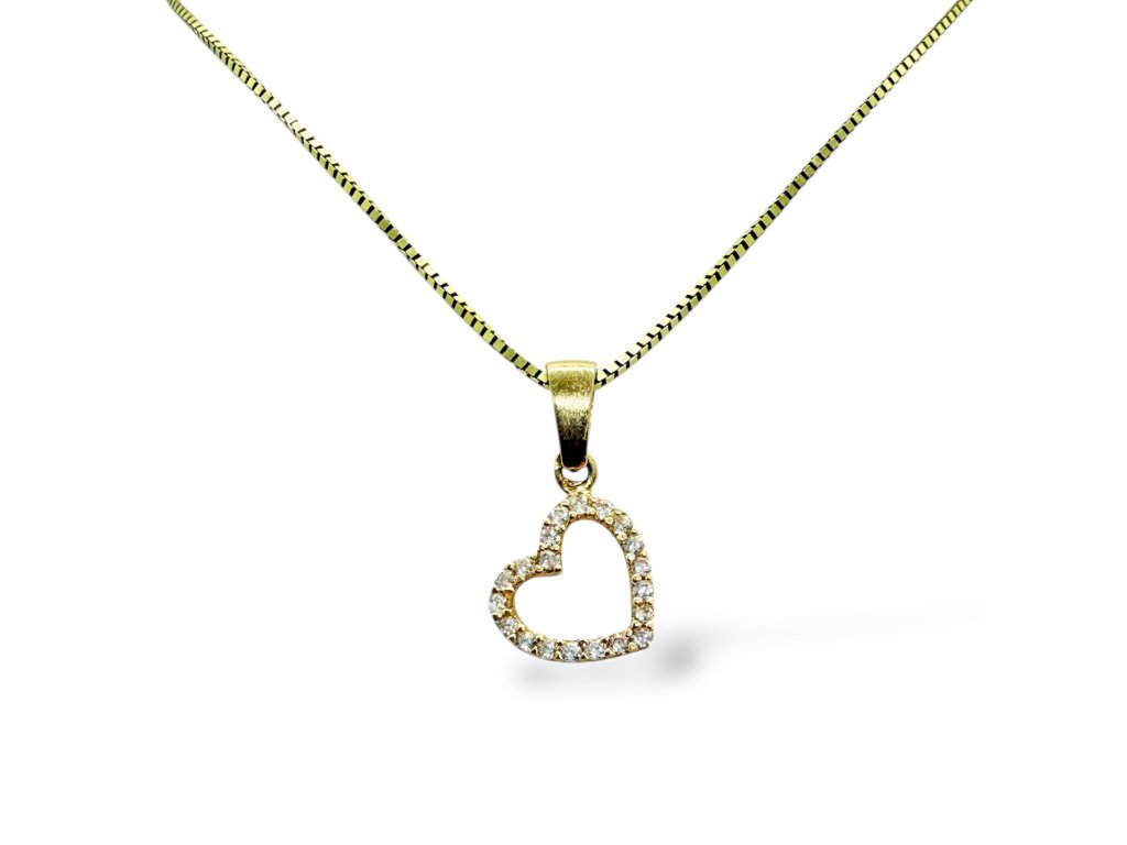 Jemný přívěšek ze žlutého zlata AU 585/1000. Přívěs ve tvaru srdíčka, zdobený drobnými zirkony. Řetízek není součástí přívěsu.