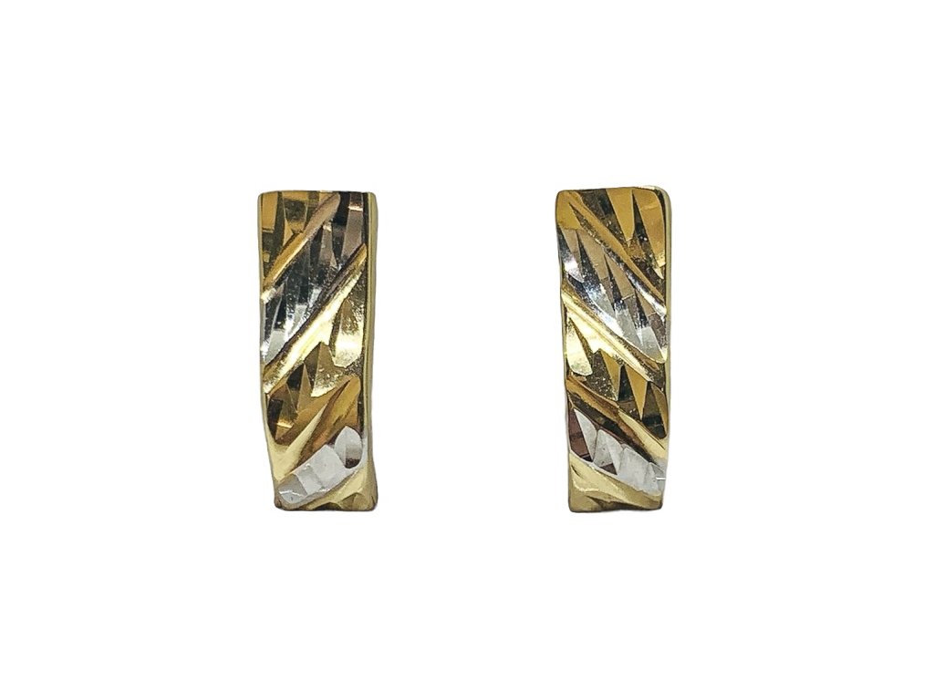 Dámské náušnice ze žlutého zlata AU 585/1000. Náušnice zdobí proužky z bílého zlata.